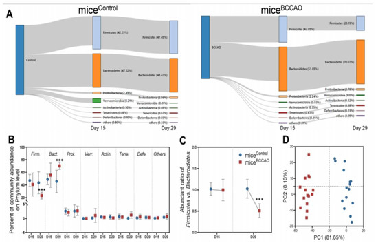 (A,B) Metagenomic analysis of mice in BCCAO and control groups showed significant changes in gut microbial composition. (C) Firmicutes/Bacteroidetes ratio was reduced in BCCAO vs. control groups on day 29 after FMT. (D) The effects of baicalin treatment on the gut microbial populations at the phylum level showed that the plot of principal component 1 against principal component 2 formed a distinct cluster. Phylum clustering in BCCAO group was different from that in the control group. *** p < 0.01. The figure is reused as per journal copyright permission [145].