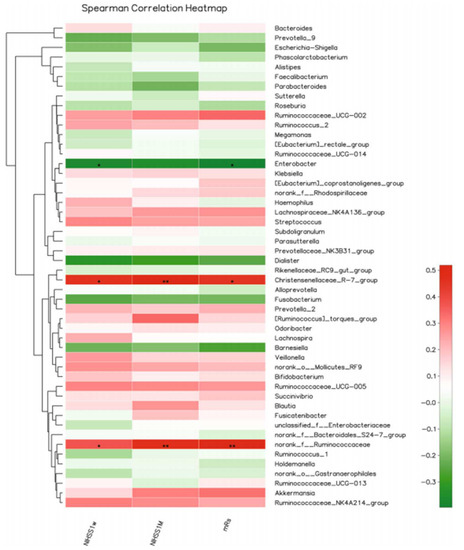 Heat map of Spearman correlation coefficient analysis, including the National Institutes of Health Stroke Scale (NIHSS) after 7 and 30 days and modified Rankin scale (mRS), was used to explore the relationship between the gut microbiota and severity or outcome of cerebral ischemic stroke patients. * p < 0.05, ** p < 0.01. The figure is reused as per journal copyright permission [113].