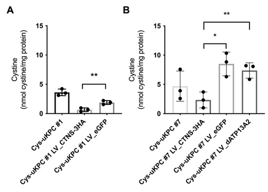 Then, in separate transduction experiments per clone, two Cys-uKPC clonal cell lines were complemented with CTNS cDNA via LV transduction, followed by antibiotic selection (Cys-uKPC #1 LV_CTNS-3HA; Cys-uKPC #7 LV_CTNS-3HA). As the vehicle control, LV expressing a control protein (eGFP or dATP13A2, an inactivated lysosomal protein—LV_eGFP or LV_dATP13A2) was taken along. Protein expression of CTNS cDNA was confirmed by Western blot in both CTNS complemented clones (Cys-uKPC #1 LV_CTNS-3HA; Cys-uKPC #7 LV_CTNS-3HA) (Figure S8). In each Cys-uKPC clonal cell line, CTNS protein addition resulted in a significant, about 2.5 to 3-fold, reduction in cystine levels, compared to their vehicle controls (Figure 5; panel A: Cys-uKPC #1; panel B: Cys-uKPC #2).