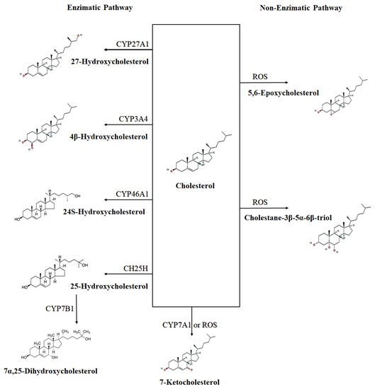Oxysterols are oxidized derivatives of cholesterol [5,6,7,8], being intermediate compounds in the biosynthesis of bile acids, steroid hormones, and 1,25-dihydroxyvitamin D3 [5,9,10]. Oxysterols can be formed either enzymatically, by the action of some members of the CYP (cytochrome P450) family, or non-enzymatically, by the action of ROS (Figure 1) [3,9,10]. Oxysterols present in the diet may contribute to the total pool of oxysterols in the body [9,10].
