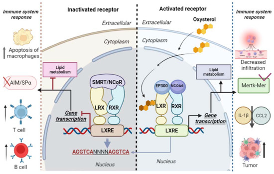 Liver X receptors (LXRs) and retinoid X receptors (RXRs) form heterodimers and bind to LXR response elements (LXREs). The LXR/RXR binding regions are composed of repeated sequences of AGGTCA and four nucleotides (NNNN). This region is responsible for the regulation of activated target genes via LXR/RXR. Inactivation of the LXR/RXR complex occurs by binding with corepressors (nuclear receptor corepressor (NcoR), retinoic acid silencing mediator, and thyroid hormone receptor (SMRT)). In the presence of oxysterols, coactivators (nuclear receptor coactivator 6 (NCOA6) and histone acetyltransferase p300 (EP300)) bind to the LXR/RXR complex, activating the expression of genes involved in lipid metabolism and in innate and cellular immune response. Both the inactivation and the activation of LXR receptors are associated with immune responses.