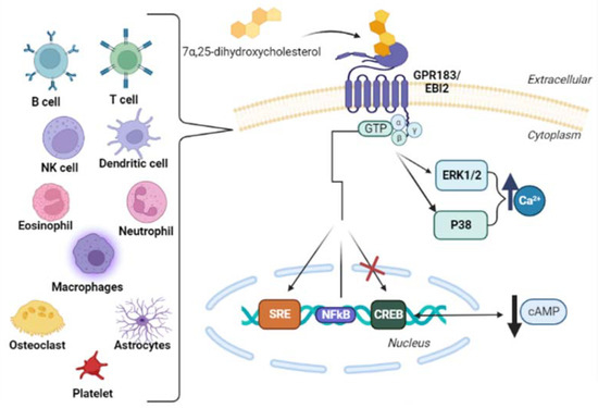 Schematic pathway of EBI2 receptor activation in cells that express this receptor. 7α,25-dihydroxycholesterol, a ligand of EBI2 (Epstein–Barr-virus-induced molecule-2), activates the GTPases family and mitogen-activated protein kinases/extracellular signal-regulated kinase (ERK) and P38 to intracellular calcium flux. In the nucleus, GTPases stimulate the expression of SRE (Serum Response Element) and the expression of NFκB (nuclear factor kappa-light-chain-enhancer of activated B cells) (weak stimulation), and inhibit the expression of CREB (cAMP Response Element-Binding Protein), downregulating the production of cAMP (cyclic Adenosine Monophosphate) [53,61].