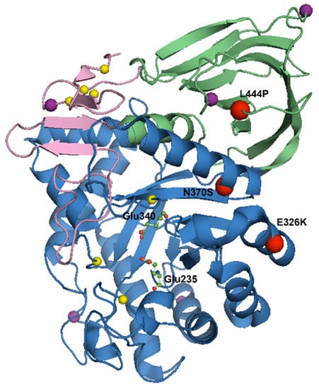 Crystal structure of glucocerebrosidase at pH 5.5 (PDB code 3GXI). Domain I is shown in pink. Domain II is shown in green. Domain III is shown in blue. The active site catalytic residues Glu 235 and Glu 340 are shown as ball-and-stick models. The five N-linked glycosylation sites (Asn 19, Asn 59, Asn 146, Asn 270 and Asn 462) are shown as purple spheres. The free cysteine residues are shown as yellow spheres. The three most common GBA mutations, L444P, N370S and E326K, are labelled as red spheres. Figure created using The PyMOL Molecular Graphics System, Version 1.2r3pre, Schrödinger, LLC .