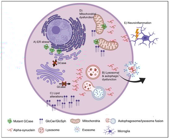 Over 300 pathogenic GBA mutations have been identified [9,10]. These have been associated with loss- and gain-of-function mechanisms. A persistent lack of GCase activity may influence the autophagic-lysosomal pathway (ALP) and has been associated with aggregation of alpha-synuclein. The presence of mutant GCase protein can exert toxic gain-of-function pathways including endoplasmic reticulum (ER) stress and the unfolded protein response (UPR). Dysfunction of mitochondria, the inflammatory pathway and lipid homeostasis have also been implicated in GBA-associated PD (GBA-PD) and can contribute to the pathogenic accumulation of alpha-synuclein [11].