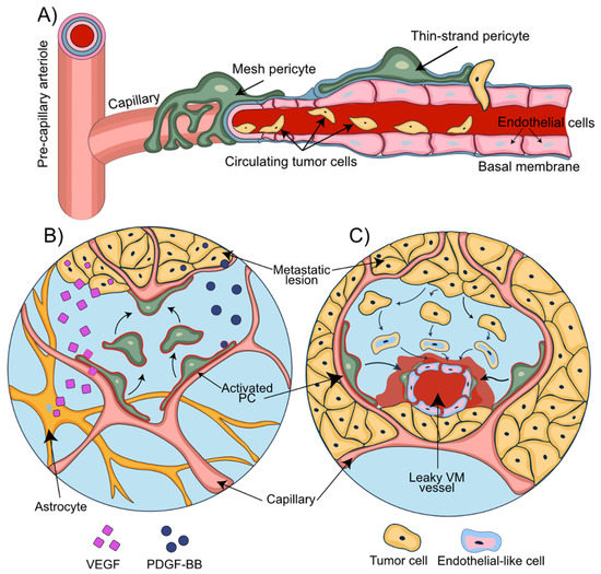 Pericytes support the disruption of the NVU during metastasis. (A) A consecutive process of rolling, adhesion, and transendothelial migration of circulating tumor cells results in the extravasation of the metastatic breast cancer cells. (B) Tumor and astrocyte-secreted VEGF contributes to vessel co-option. PDGF-BB secreted by the metastatic tumor cells mediates displacement of pericytes and their relocation towards the co-opted and newly formed blood vessels. (C) Transformation of the tumor cells into endothelial-like cells allows the formation of the vascular mimicry vessels. Pericytes migrate towards these newly formed leaky vascular mimicry vessels and stabilize them.