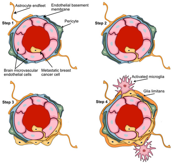 Key steps of the breast-to-brain metastatic process. (Step 1) Adhesion of the metastatic circulating breast cancer cells to the brain microvascular endothelial cells; (Step 2) BBB passage of metastatic cells leaving the circulation by transendothelial migration; (Step 3) adaptation and proliferation of the metastatic cells in their new perivascular niche; (Step 4) establishment of the tumor microenvironment with metastatic breast cancer cells interacting with the key NVU cellular partner pericytes, astrocytes, and microglia. Astrocyte foot processes associated with the parenchymal basal lamina form the outermost layer of central nervous tissue known as glia limitans.