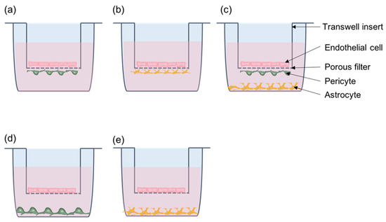 Transwell system for co-culture. (a) Direct contact model with endothelial cells and pericytes. (b) Direct contact model with endothelial cells and astrocytes. (c) Tri-cellular culture model with endothelial cells, pericytes, and astrocytes. Endothelial cells and pericytes are in contact. (d) Non-contact model with endothelial cells and pericytes. (e) Non-contact model with endothelial cells and astrocytes.