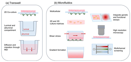 Properties of BBB in vitro models. (a) Transwell systems utilize a porous filter insert that divides culture wells into luminal and abluminal compartments and allows for diffusion of molecules and cell migration across the filter. (b) Microfluidic devices recapitulate a more complex tissue environment in vitro by co-culturing cells in 2D and 3D matrices. Parameters including shear stress and gradient formation are tunable to establish a controlled microenvironment. Microfluidics enable integration of sensing systems and high-resolution microscopy. Multichannel designs allow samples to be screened in parallel, creating compact medium-throughput systems for simulating biological conditions and enabling drug screening. Brain EC are shown in pink on the luminal side, and brain pericytes are marked in green on the abluminal side.