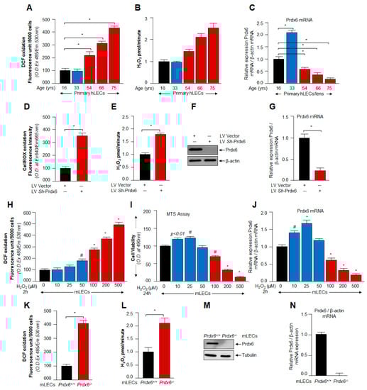 LECs displayed increased ROS levels, H2O2 generation and reduced level of Prdx6 with advancing age. (A–C) Increased ROS-induced DCF toxicity and H2O2 generation with loss of Prdx6 expression was observed in human LECs with aging. (A) Intracellular ROS were quantified in primary hLECs of different ages using H2-DCF-DA dye. The data represent the mean ± S.D. from three independent experiments (* p < 0.001). (B) H2O2 levels in primary hLECs were measured using Amplex Red reagent and Horseradish Peroxidase (HRP) solution. The data represent the mean ± S.D. from three independent experiments (* p < 0.001). (C) Total RNA was extracted from LECs isolated from lenses of human individuals of variable age groups and transcribed cDNA was submitted to real time PCR analysis with primers specific to Prdx6. The data represent the mean ± S.D. from three independent experiments (* p < 0.001). (D–G) Prdx6-depleted hLECs displayed increased ROS-induced DCF toxicity levels and production of H2O2 in cells. hLECs were stably infected with GFP (green fluorescence protein) linked lentiviral (LV)-vector or GFP- linked LV Sh-Prdx6 as noted in Materials and Methods. (D,E) Stably infected hLECs with LV-Vector or LV Sh-Prdx6 was harvested in 96 well plate. ROS-induced CellROX toxicity (D) and H2O2 generation (E) in cells were quantified using CellROX Red reagent dye assay and Amplex Red reagent/Horseradish Peroxidase (HRP) solution, respectively. The data represent the mean ± S.D. from three independent experiments. * p < 0.001; LV Sh-Prdx6 versus LV-Vector. (F,G) Cellular extract and RNA were isolated from infected hLECs and examined the Prdx6 protein and mRNA expression using western blot and RT-qPCR analysis with their specific probes, respectively. The data represent the mean ± S.D. from three independent experiments. * p < 0.001; LV Sh-Prdx6 versus LV-Vector. (H–J) H2O2-induced hormetic response on ROS generation, cell viability and antioxidant gene Prdx6 expression in lens epithelial cells. (H) mLECs were harvested in 96-well plate and treated with increasing concentrations of H2O2 as indicated. After 2 h, intracellular ROS were quantified using H2-DCF-DA dye. The data represent the mean ± S.D. from three independent experiments: # p < 0.05, * p < 0.001. H2O2 treated versus untreated LECs. (I) MTS assay was carried out to examine cell viability against oxidative stress after 24 h. The data represent the mean ± S.D. from three independent experiments: # p < 0.05, * p < 0.001. H2O2 exposed versus unexposed LECs. (J) Total RNA was isolated from mLECs exposed to increasing concentrations of H2O2 as indicated. Prdx6 mRNA expression was analyzed by RT-qPCR using specific primers to Prdx6. The data represent the mean ± S.D. from three independent experiments: # p < 0.05, * p < 0.001. (K–N) Prdx6−/− LECs, a model for aging showed increased levels of ROS accumulation and higher level of H2O2 generation. (K) ROS-induced DCF oxidation levels were quantified in Prdx6+/+ and Prdx6−/− mLECs using H2-DCF-DA dye. (L) Prdx6-deficient mLECs showed increased H2O2 generation as examined using Amplex Red reagent/ Horseradish Peroxidase (HRP) solution. The data represent the mean ± S.D. from three independent experiments (* p < 0.001). (M,N) Total protein and RNA were isolated from Prdx6+/+ and Prdx6−/− mouse LECs and the protein and mRNA expression were assessed by Western blot (M) and real-time PCR (N), respectively. Data are the mean ± S.D. of three independent experiments. * p < 0.001 vs. control.
