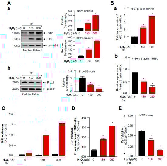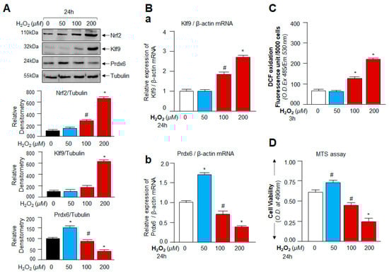 Knowledge regarding the redox signaling changes and the molecular event(s) in context to ROS-mediated beneficial and/or deleterious signaling(s) (i.e., the hormetic effect of ROS) is extremely limited. However, by reviewing previously published studies [,], we found that Klf9 can negatively regulate the antioxidant pathway during excessive stress or cells treated with excessive doses of electrophilic compounds. Thus, we examined expression levels of Nrf2, Klf9, and antioxidant protein Prdx6 and determined their correlation with ROS levels and cell viability in hLECs exposed to mild to high concentrations of H2O2 as noted in Materials and Methods. Protein blot analysis of total cellular extract prepared from hLECs treated with increasing concentrations of H2O2 is indicated in Figure 2. The visualization of an immunoblotted membrane with an antibody specific to Nrf2 or Klf9 or Prdx6 revealed a significant increase in Nrf2 levels, and paradoxically the increased expression of Nrf2 was associated with the aberrant expression of Klf9 (not a favorable target for Nrf2 pathway) and a dramatic attenuation of Prdx6 expression in cells treated with ≥100 µM of H2O2 concentrations. Next, we asked whether the increase in Klf9 protein and reduction in Prdx6 protein occurred at their transcript level. To examine this, we performed RT-qPCR. qPCR analysis (Figure 2B) revealed that hLECs exposed to increasing concentrations of H2O2 (≥100 µM) displayed increased expression of Klf9 mRNA with a significant decrease in Prdx6 mRNA expression. Conversely, we found that cells exposed to lower concentrations of H2O2 (<100 µM) had increased Prdx6 expression with only basal expression of Klf9, suggesting that a lower degree of oxidative stress could not induce aberrant Klf9 expression (Figure 2A,B; blue bar).