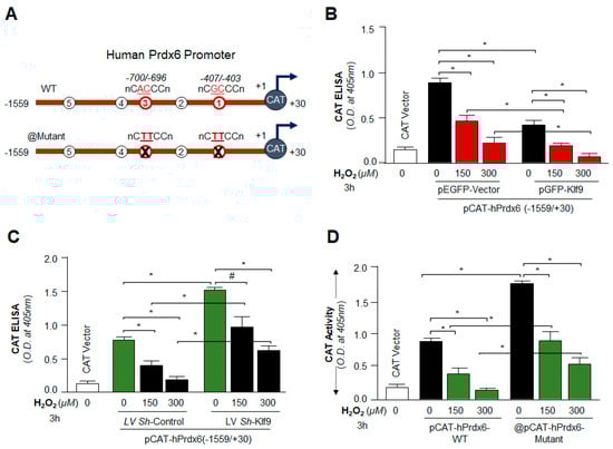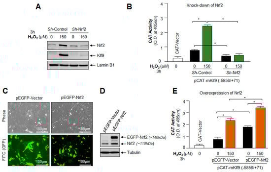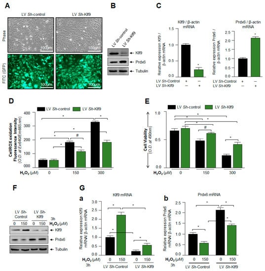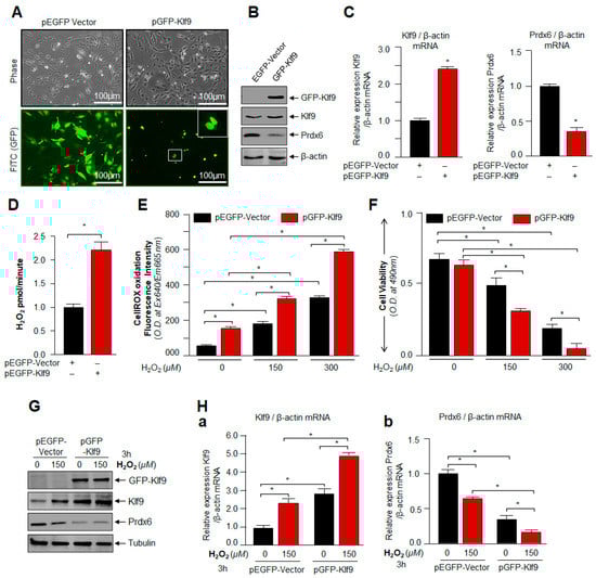 ROS levels were assayed following the company’s protocol (CellROX® Deep Red Oxidative Stress Reagent, Catalog No. C10422) and as described in our published protocol []. For the Klf9 overexpression assay, hLECs were transfected with pEGFP-Vector or pGFP-Klf9 plasmid. Then, 48 h later, transfectants were exposed to H2O2 as indicated in figure legends. For the Klf9 knock down assay, LV Sh-control and LV Sh-Klf9 infected hLECs (5 × 103) cells were seeded in a 96-well plate. Then, 24 h later, these cells were treated with increasing concentrations of H2O2. 2–3 h of H2O2 exposure, CellROX deep red reagent was added with a final concentration of 5 µM and were incubated at 37 °C for 30 min. A medium containing CellROX deep red reagent was removed and fixed with 3.7% formaldehyde. Then, 15 min later, the fluorescence signal was recorded at Ex 640 nm/Em 665 nm with Spectra Max Gemini EM (Mol. Devices, Sunnyvale, CA, USA).