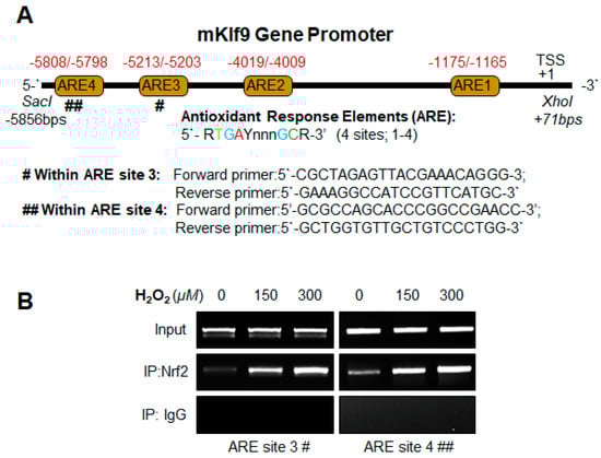 The ChIP assay was conducted with the ChIP-IT® Express (Cat. No. 53008; Active Motif, Carlsbad, CA, USA) according to the manufacturer’s instruction(s) as well as following our published protocol [,,,]. Antibodies used were control IgG, an antibody specific to Klf9 (Catalog No. 701888, Thermo Scientific) and Nrf2 (Catalog No. Ab180845, Abcam). RT-PCR amplification was performed with 5 μL of DNA sample. The program applied for amplification was 3 min for 94 °C (denaturation), 20 s at 95 °C, 30 s at 59 °C, and 30 s at 72 °C for 36 cycles in 25 μL reaction volume (RT-PCR). The data obtained with RT-PCR was resolved onto 1.5% agarose gel and the band was visualized under UV, and images were captured. The data obtained from qPCR is presented as a histogram. Primers used are noted below.