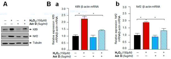 SRA-hLECs (hLECs) were derived from 12 infants who underwent surgery for retinopathy of prematurity [] (a kind gift of late Dr. Venkat N. Reddy, Eye Research Institute, Oakland University, Rochester, MI, USA). Human LECs cell lines (SRA01/04) were immortalized with SV40. These cells were maintained in DMEM with 15–20% FBS, 100 µg/mL streptomycin, and 100 µg/mL penicillin in a 5% CO2 environment at 37 °C as described previously [,]. To examine the effect of H2O2, cells were treated with serum-free medium (DMEM medium containing 0.2% BSA) with different concentrations of H2O2 in DMEM supplemented with 0.2% of BSA. H2O2 (Catalog no. H1009) and Actinomycin D (Catalog no. A9415) were purchased from Sigma-Aldrich (St. Louis, MO, USA).