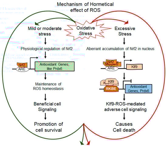 Using primary human (h) LECs of variable ages or hLECs exposed to different concentrations of oxidative stress inductor, including Prdx6-deficient mLECs, as a model system(s), here we showed that the hormetic responses to oxidative stress are linked to a degree of activation of Nrf2. We found that excessive oxidative load induced by H2O2 was directly related to Prdx6 suppression, resulting in a dramatic increase in intracellular ROS and cell death, while lower levels of oxidative stress stimulated adaptive (protective) biological response via Nrf2-Prdx6 pathways. Mechanistically, our data revealed that the aberrant accumulation of Nrf2, paradoxically, resulted in Nrf2 binding to Klf9 promoter and increasing its expression, which subsequently bound to its repressive Klf9 binding element (RKBE; CA/GCCC) of Prdx6 promoter and suppressed the Prdx6 expression, including ROS amplification and subsequent cell injuries. Together, our results showed that the molecular mechanisms of oxidative stress-mediated hormetical responses that involve the Nrf2-Prdx6 pathway and identified that Klf9’s activation plays a pivotal role. Because aberrant stimulation of Klf9 leads to ROS amplification-dependent cell death, we propose that Klf9 should be a therapeutic target to treat or prevent oxidative stress-associated diseases.