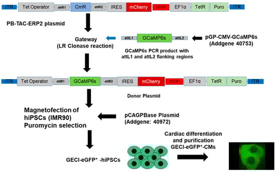Generation of Tet-inducible GECI-eGFP+-hiPSCs -enhanced green fluorescent protein (eGFP+)-human-induced pluripotent stem cell (hiPSCs) for live calcium flux measurements in hiPSC-cardiomyocytes (CMs). GCaMP6 is a GECI generated from a fusion of the eGFP, calmodulin (CaM), and a short peptide from myosin light chain kinase (M13). To generate the Tet-inducible GECI plasmid, we amplified the GCaMP6s sequence from pGP-CMV-GCaMP6s (40753; Addgene, Watertown, MA, USA) by adding a gateway adapter sequence at both 5′ and 3′ end. The amplified GCaMP6s was cloned into the Piggybac (PB), PB-TAC-ERP2 vector (80478; Addgene, Watertown, MA), using the Gateway™ LR Clonase™ II enzyme mix (Thermo Fisher, Waltham, MA, USA). The hiPSCs were transfected with the PB-TAC-ERP2-GCaMP6s plasmid (Donor plasmid; Addgene, Watertown, MA, USA) and the piggybac transposase vector (pCAGPBase; Addgene, Watertown, MA, USA) applying the magnetofection method (Magnetofectamine O2, OZ Biosciences, Marseille, France) to generate the GECI hiPSC line. The transposase enzyme facilitates the integration of the DNA elements in ITR sites present in the genome at random location The selection was performed with puromycin at a concentration of 2 µg/mL. After generation of the GECI-eGFP+-hiPSCs, cells were differentiated into GECI-eGFP+-CMs. Induction of GECI in CMs was induced by adding Doxycycline (500 nM) for 6 h (attL-recombination site left, attR-recombination site right, attB-attachment site bacteria).
