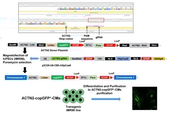 Generation of α-actinin (ACTN2)-copepod green fluorescent protein (copGFP+)-human-induced pluripotent stem cell line (IMR90) by the CRISPR-Cas9 and the homology-directed recombination (HDR) approach. The overall CRISPR-Cas9-based strategy to generate the transgenic ACTN2-copGFP-IMR90 line was by copGFP knock-in at chromosome. First, gRNA targeting of the ACTN2 3′ end was designed to delete the stop codon in exon 21 of the native ACTN2, located into chromosome 1. The donor plasmid with ~600 bp 5′ and 3′ homology arms was designed and ordered from ALSTEM, LLC San Francisco, US. The homology arms were designed in such a way that upon HDR the stop codon from the native ACTN2 gene could be deleted, whereas the reading frame remained as it was. These homology arms were then cloned into the pUC57 plasmid backbone along with the copGFP and LoxP flanked puromycin resistance gene with the EF1α promoter. To avoid any interference from copGFP with the ACTN2 functions and vice-versa, a glycine-rich linker (GGGGSGGGGSGGGGS) sequence was added. The linker provided a flexible connection between the two proteins, while avoiding interference in their functional properties (cloning sequences are shown in the Table S1, Supplemental Information). The donor plasmid along with ACTN2-gRNA plasmid was transfected into IMR90 cells using the magnetofectamine method (OZ Biosciences, Marseille, France) and positive clones were selected using puromycin (2 µg/mL). Positive clones were expanded and knock-in of copGFP was confirmed by differentiating the cells into cardiomyocytes by following our standard differentiation protocol.