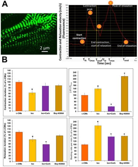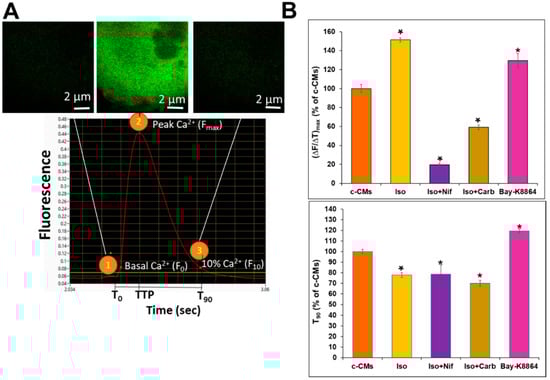 T0 represents the time point immediately before a rise in [Ca2+]i. Time-to-peak (TTP) represents the time required for the transient to reach a maximum (Figure 3A). T90 represents the time required for the fluorescence signal to return from its maximum to 10% of the amplitude. We calculated the maximum slope of the rise in [Ca2+]i, using (∆F/∆T)max; this value was used as indicator for inotropic effects (Figure 3A). Normalization of the six different, independent experiments was performed by expressing (∆F/∆T)max and T90 values, calculated for experiments where different agents had been used, as percentages of the values calculated for c-CMs, whereby the latter were set to 100%. A representative video recording after stimulation of the c-CMs with 1 µM of adrenoreceptor agonist [1-hydroxy-2-(propan-2-ylamino)ethyl]benzene-1,2-diol;hydrochloride Isoprenaline (Sigma Aldrich, St. Louis, MO, USA) and subsequently with 1 µM of L-Type channel blocker dimethyl 2,6-dimethyl-4-(2-nitrophenyl)-1,4-dihydropyridine-3,5-dicarboxylate;hydrochloride Nifedipine (Sigma Aldrich, St. Louis, MO, USA) is shown in Video S2. As seen in the video, the velocity of the Ca2+-waves was significantly increased by Isoprenaline treatment; while, as expected, addition of Nifedipine not only reduced the velocity, but also the resting sarcoplasmic Ca2+ level (CM beating also stopped). A representative video recording of the control (c-CMs) followed by addition with Isoprenaline (1 µM) and subsequently by addition of 1 µM of acetylcholine receptor agonist 2-carbamoyloxyethyl-trimethyl-azanium Carbachol (Sigma Aldrich, St. Louis, MO, USA) is shown in Video S3. Again, Isoprenaline significantly increased the velocity of Ca2+-fluorescence waves, while Carbachol significantly reduced the velocity of the Ca2+ fluctuations as well as the Ca2+ fluorescence correlated with high [Ca2+]i. A representative video recording of the c-CMs treated with the L-type calcium channel agonist 1 µM of (±)-1,4-Dihydro-2,6-dimethyl-5-nitro4-(2-[trifluoromethyl]-phenyl)pyridine-3-carboxylic acid methyl ester Bay-K8864 (Sigma Aldrich, St. Louis, MO, USA) is shown in Video S4. As expected, Bay-K8864 drastically increased the velocity of the fluctuations of Ca2+-fluorescence. As indicated in Figure 3B, Isoprenaline and Bay-K8864 caused an 51% and 30% increases in (∆F/∆T)max over the values for c-CMs (= 100%), respectively. The addition of Carbachol or Nifedipine to the Isoprenaline-stimulated c-CMs resulted in a significant reduction of (∆F/∆T)max compared with the c-CM value, reducing these values from 100% to 59% and 19%, respectively. Isoprenaline alone resulted in the reduction of the T90 value, compared with that of the c-CM value, from 100% to approximately 78%, whereas Bay-K8864 induced a 20% increase in the T90 value over the c-CM value.