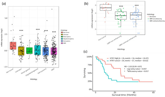 5-HT7R mRNA expression in human brain cancers. (a) 5-HT7R is lower expressed in many brain tumors including GBM compared with normal tissues, data from Rembrandt. (b) The mRNA expression of the 5-HT7R was lower in tumor tissues of GBM patients than in the corresponding normal tissues, data from Gill database) *** p < 0.001, Tukey’s Honest Significant Difference (HSD); (c) Kaplan–Meier estimator survival analysis from Nutt datasets. * p < 0.05, Wilcoxon-Mann-Whitney test. The split in two groups, HTR7 low and HTR7 high has been performed by the median. Data from TCGA, http://cancergenome.nih.gov, 13 March 2022.