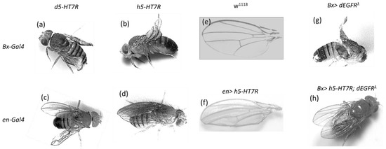First, we wanted to assess the effect of 5-HT7 receptor expression in a non-nervous tissue. For this, we have chosen the Drosophila wing which is not essential for Drosophila viability. We used two Gal4 drivers: Bx-Gal4 and en-Gal4 which express Gal4, respectively, in the dorsal and posterior compartment of the wing disc. Several independent transgenic lines expressing 5-HT7R were used and all exhibit the same phenotypes. Here, we present results from lines with insertion on the second chromosome. Interestingly, expression of Drosophila (d5-HT7R) or human 5-HT7R (h5-HT7R) in the wing imaginal disc affects wing patterning (Figure 2). When expressing d5-HT7R in the dorsal compartment, wing patterning is severely affected, and we observed a “curly-like” phenotype (Figure 2a). Expression of h5-HT7R results in a milder phenotype with some F1 progeny also showing a “curly”-like phenotype (Figure 2b). Such an observation indicates that the dorsal compartment is smaller than the ventral one and hence suggests that cell proliferation has been reduced in the dorsal compartment.