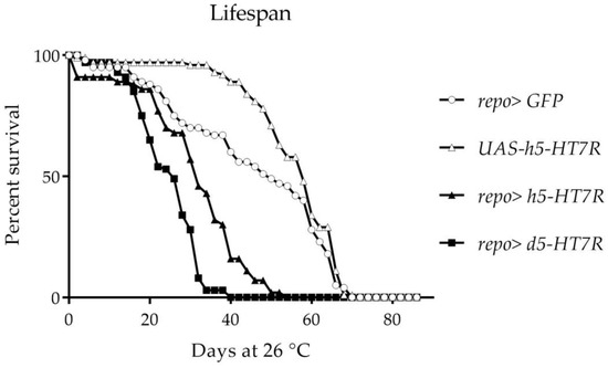 Expression of Drosophila or human 5-HT7 receptor in glial cells reduces lifespan of flies. Controls are repo>GFP and UAS-h5-HT7R. Results correspond to the percent of living flies.