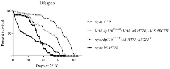 Lifespan of escaper flies. Results correspond to the percentage of living flies repo>dp110CAAX; h5-HT7R; dEGFRλ as a function of time at 26 °C. Lifespan of controls corresponding to the driver repo>GFP alone and UAS-h5-HT7R or UAS-110CAAX, h5-HT7R; dEGFRλ alone is also shown.