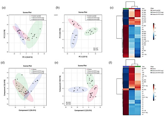 HR-MAS based metabolomics results. (a–c) Comparison of controls brains (repo-Gal4), and brains expressing h5-HT7R in a glioma context (“small” brains and “large” brains). (d–f) Comparison of gliomas and brains expressing h5-HT7R in a glioma context (“small” and “large” brains). (a,d) Unsupervised multivariate analysis PCA, (b,e) PLS–DA score plot, (c,f) Heat map of the first 25 most significant buckets with group averaging. R2 is the percentage of the data explained by the supervised model and Q2 is the quality of the prediction. Arg: arginine; Glu: glutamate; Lac: lactate; MyoI: myoinositol; PC: phosphocholine; PE: phosphoethanolamine; Pro: proline; L1, L2, L3, L4, L5 and L6: lipids. L1: CH3; L2: (CH2)n; L3: CH2-CH2-CO; L4: CH2-C=; L5: CH2-CO; L6: CH=CH.