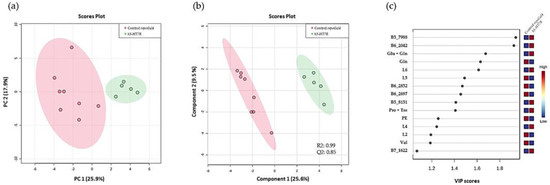 All the statistical analyses were done with MetaboAnalyst 5.0 [68]. Principal Component Analysis (PCA) was first performed to detect any clustering of samples and the presence of outliers. Then, Partial Least Square Discriminant Analysis was performed to build a prediction model on our data set using a standard method scaling and CV cross-validation method. Model validation was done by permutation testing based on separation distance using 100 iterations. The predictive ability of the model is assessed by Q2 which is obtained during cross-validation. To be considered highly predictive, the model had to have a Q2 greater or close to 0.8.