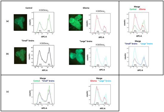 Analysis of H3K9me2 by flow cytometry in glial cells (with GFP expression). Pattern of H3K9me2 in glial cells is shown for controls (repo>GFP), glioma (repo>dp110CAAX; dEGFRλ), “small” and “large” brains (repo>dp110CAAX; h5-HT7R; dEGFRλ). Two populations of glial cells P1 and P2 differing by their methylation rate have been identified. (a) Comparison between controls and gliomas. (b) Comparison between “small” and “large” brains. (c) Comparison between “small” brains and controls and between “large” brains and gliomas.