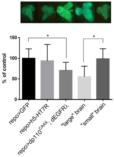 Measurement of cAMP levels has been performed in brains of controls (repo>GFP), glioma (repo>dp110CAAX; dEGFRλ) and expressing h5-HT7R alone (repo>h5-HT7R) and in “small” and “large” brains (repo>dp110CAAX; h5-HT7R; dEGFRλ). Values have been normalized with the concentration of proteins detected in each sample and expressed as a percentage of control. The upper panel represents images of fluorescent brains for each associated condition and observed by fluorescence microscopy. *, p< 0.05. Statistical analysis was done by one-way ANOVA using Tukey’s multiple comparison test, n = 8.