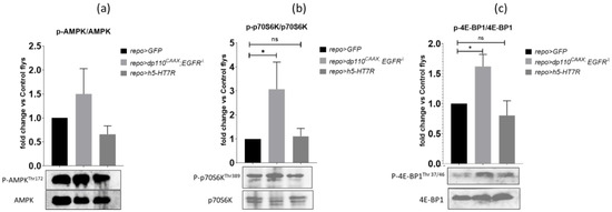 Evaluation of phosphorylation of AMPK, p70S6K and 4E-BP1 in glioma and in brains expressing h5-HT7R alone. Western blots of larval brains of controls (repo>GFP), glioma (repo>dp110CAAX; dEGFRλ) and expressing h5-HT7R alone (repo>h5-HT7R) probed with (a) p-AMPKThr172 and AMPK antibodies, (b) p-p70S6KThr389 and p70S6K antibodies and (c) p-4E-BP1Thr37/46 and 4E-BP1 antibodies. Quantification of mean fold change in phosphorylation was analyzed by one-way ANOVA, Kruskal–Wallis test, Dunn’s multiple comparisons test, n = 6. *, p < 0.05. ns, non significant (p > 0.05).