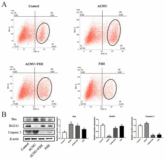 The increased apoptosis of GCs caused by ACNU was significantly decreased in the presence of FSH (Figure 4A). The results of the Western blot analysis showed that treatment of FSH reduced the expression of Bax and Caspase 3 and increased the expression of Bcl2A1 in the ACNU-treated cells (Figure 4B).