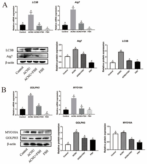 Changes in Golgi complex and autophagy after FSH treatment. (A) Relative expression of proteins and mRNA related to autophagy in GCs treated with ACNU and/or FSH. Bars with different superscripts are statistically different (p < 0.05). (B) Relative expression of proteins and mRNA related to Golgi complex morphology caused by DNA damage in GCs treated with ACNU and/or FSH. Bars with different superscripts are statistically different (p < 0.05).