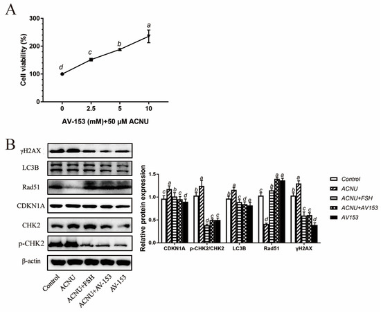 Treatment with 5 μM and 10 μM AV-153 remarkably increased the viability of GCs (Figure 6A). The results of the Western blot showed that the p-CHK2/CHK2, CDKN1A, γH2AX and LC3B expression and Rad51 degradation after ACNU induction were significantly inhibited by FSH, similar to the effect of AV-153 treatment (Figure 6B).