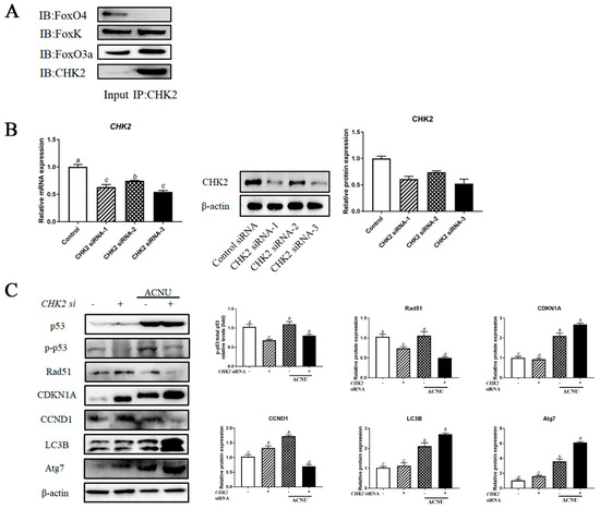 The interactions of CHK2 with FoxK or FoxO3a. (A) The cell lysates were processed for coimmunoprecipitation with anti-CHK2, followed by probing with anti-FoxO3a, FoxK and FoxO4. IP, immunoprecipitation. (B) GCs transfected with CHK2 siRNA or scrambled control siRNA for 24 h/48 h were cultured for 24 h and then the cells were rinsed with PBS. The expression of CHK2 was determined by qPCR and the expression of CHK2 protein was determined by Western blot. Bars with different superscripts are statistically different (p < 0.05). (C) GCs transfected with CHK2 siRNA for 24 h were cultured in media containing ACNU. 24 h later, the cells were rinsed with PBS and the expressions of p53, p-p53, Rad51, CDKN1A, CCND1, LC3B and Atg7 were determined by Western blot. Bars with different superscripts are statistically different (p < 0.05).
