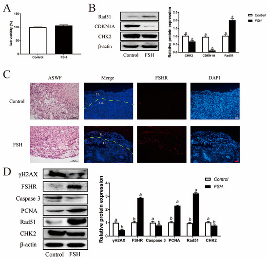 In addition to the exploration of the effect of FSH on follicle aging, GCs were isolated from ASWFs from D280 hens and treated with FSH (0.01 IU/mL) in culture. Both the cell viability and DNA damage were relieved in GCs from ASWFs (Figure 8A,B). Next, ASWFs were treated with FSH (0.1 IU/mL) for 72 h in culture. The FSHR expression was significantly elevated in ASWFs after FSH treatment (Figure 8C). Meanwhile, treatment of FSH increased cell proliferation and DNA repair in ASWFs. Western blot experiments showed that the PCNA and Rad51 were increased after treatment of FSH in ASWFs. The expression of caspase 3 was decreased in FSH-treated ASWFs. Moreover, treatment with FSH significantly increased the expression of FSHR and decreased the expression of CHK2 and γH2AX (Figure 8D).