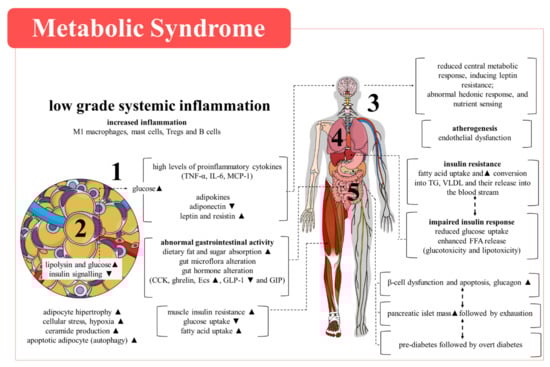Mechanisms of metabolic syndrome (MS) pathophysiology. MS is a result of a metabolic imbalance which involves alterations in different tissues and a variety of molecules. (1) Insulin resistance is accompanied by (2) a low-grade inflammation in the adipose tissue characterized by reduction of adipokines such as adiponectin, enhanced levels of leptin and resistin, accumulation of inflammatory cells in the adipose tissue, paralleled with high levels of cytokines/chemokines and reactive oxygen species. Alterations of the central (hypothalamus and the brainstem) and peripheral mechanisms of hunger and satiety occur (3). All these events contribute towards (4) decreased energy expenditure, hyperglycaemia and dyslipidaemia, increasing the risk for type 2 diabetes and cardiovascular diseases. Nutrient absorption (5) and the gut microbiota play key roles in the modulation of MS, aiding the connection between the brain and metabolic tissues. TG—triglycerides; VLDL—very low-density lipoprotein; CCK—cholecystokinin; Ecs—estrogens; GLP-1—glucagon-like peptide-1; GIP—gastric inhibitor peptide; TNFα—tumour necrosis factor α; IL-6—interleukin-6; MCP-1—macrophage chemotatic protein-1.