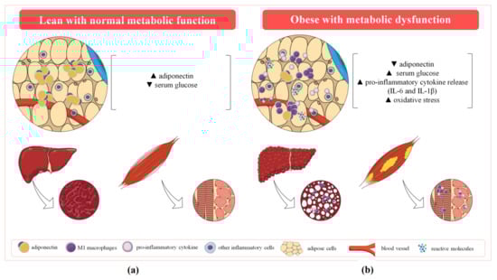 In addition to adiponectin dysregulation and oxidative stress (Figure 2), studies have provided compelling evidence that the progress of metabolic dysfunction is closely related to a state of low-grade chronic inflammation [66,67,68], which is primarily characterized by recruitment of pro-inflammatory macrophages to the adipose tissue. Macrophages enhance the inflammatory response [69,70], contributing to the accumulation of ectopic lipids and the development of insulin resistance [71]. M1 and M2 macrophages play an important role in adipose tissue during low-grade inflammation [72] through the production and release of TNFα, IL-1β, and IL-6, and IL-10, respectively [73,74]. M1 macrophages recruited to the pancreatic islets cause pancreatic β-cell dysfunction and apoptosis [74]. Furthermore, the production of pro-inflammatory cytokines within the adipose tissue leads to adipocyte hypertrophy [70]. The local release of FFA, especially saturated fatty acids, activates toll-like receptor 4 on macrophages [75,76], triggering the activation of NF-κB and the additional expression of pro-inflammatory cytokines [77]. These events continuously contribute to insulin resistance in the adipose tissue, liver, and skeletal muscle [78,79]. The above data reinforce the importance of inflammatory imbalance to the adipose tissue changes in MS and its comorbidities/complications [67]. Indeed, adipose tissue inflammation also impacts other tissues and organs such as the liver [80,81], pancreas [82] and muscles [83]. Fat deposition in these organs is particularly deleterious [10].