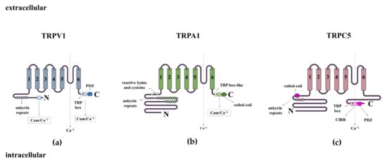 TRPV1, TRPA1 and TRPC5 structures. (a) TRPV1, (b) TRPA1 and (c) TRPC5 structures are composed of different domains including six transmembrane domains with a pore region, N and C-terminus, ankyrin repeats, coiled-coil, calmodulin (CaM)/Ca2+-binding region, TRP-box, calmodulin (CaM)/inositol 1,4,5-trisphosphate (IP3) receptor binding (CIRB), and PDZ domains.