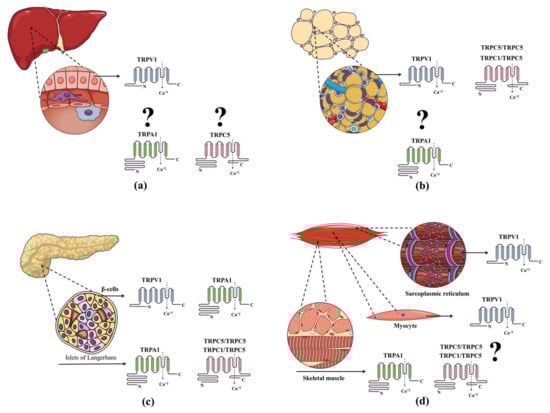 TRPV1, TRPA1 and TRPC5 expressions in metabolic tissues. (a) Liver, (b) adipose tissue, (c) pancreas and (d) skeletal muscle. All these TRPs are detected in the pancreas either as transcripts or functional proteins. TRPV1 is found in all metabolic tissues (liver, adipose tissue, pancreas and skeletal muscle). Additionally, TRPA1 and TRPC5 (either as homo or heterodimers) are expressed in the skeletal muscle and adipose tissue, respectively. The question tag (?) represents expressions yet to be confirmed: TRPA1 in the liver and adipose tissues, and TRPC5 in the skeletal muscle.