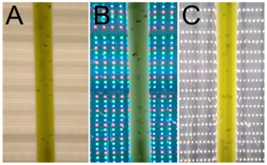Light sources used for the cultivation. (A) Fluorescent lamps, (B) RGB LEDs, (C) white LEDs.