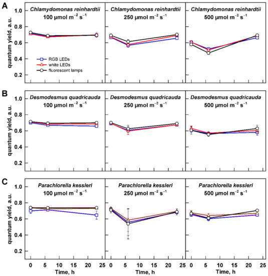 Quantum yield of the cultures grown at different light intensities. Cultures of (A) Chlamydomonas reinhardtii, (B) Desmodesmus quadricauda, and (C) Parachlorella kessleri were grown at incident light intensity 100, 250, and 500 µmol m−2 s−1 on different light sources: fluorescent lamps (black circles), RGB LEDs (blue squares), and white LEDs (red triangles). Data of three biological replicates are presented as means ± SE.