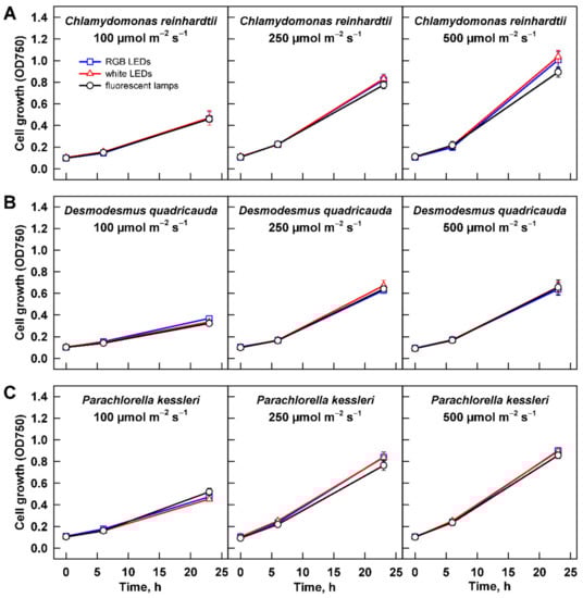 Growth of the cultures cultivated at different light intensities. Cultures of (A) Chlamydomonas reinhardtii, (B) Desmodesmus quadricauda, and (C) Parachlorella kessleri were grown at incident light intensity 100, 250, and 500 µmol m−2 s−1 on different light sources: fluorescent lamps (black circles), RGB LEDs (blue squares), and white LEDs (red triangles). Cell growth is expressed as optical density at 750 nm. Data of three biological replicates are presented as means ± SE.