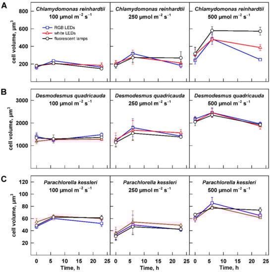 Changes in mean cell (coenobium) volume in the cultures grown at different light intensities. Cultures of (A) Chlamydomonas reinhardtii, (B) Desmodesmus quadricauda, and (C) Parachlorella kessleri were grown at incident light intensity 100, 250, and 500 µmol m−2 s−1 on different light sources: fluorescent lamps (black circles), RGB LEDs (blue squares), and white LEDs (red triangles). Data of three biological replicates are presented as means ± SE.