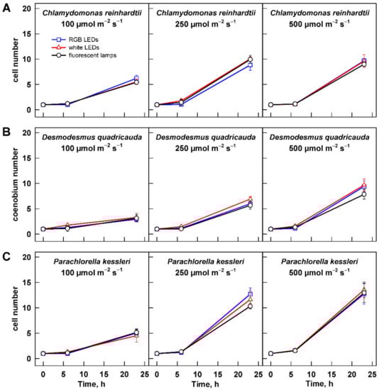 Changes in cell number in the cultures grown at different light intensities. Cultures of (A) Chlamydomonas reinhardtii, (B) Desmodesmus quadricauda, and (C) Parachlorella kessleri were grown at incident light intensity 100, 250, and 500 µmol m−2 s−1 on different light sources: fluorescent lamps (black circles), RGB LEDs (blue squares), and white LEDs (red triangles). Cell numbers were normalized to the initial values to allow direct comparison between treatments and organisms. Data of three biological replicates are presented as means ± SE.