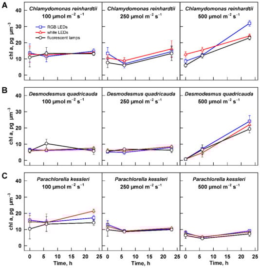 Changes in chlorophyll a content in the cultures grown at different light intensities. Cultures of (A) Chlamydomonas reinhardtii, (B) Desmodesmus quadricauda, and (C) Parachlorella kessleri were grown at incident light intensity 100, 250, and 500 µmol m−2 s−1 on different light sources: fluorescent lamps (black circles), RGB LEDs (blue squares), and white LEDs (red triangles). Chlorophyll content was normalized to the total volume of the culture at the particular time point to allow direct comparison between treatments and organisms. Data of three biological replicates are presented as means ± SE.