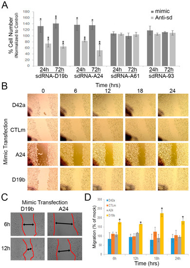 3.3. sdRNA-D19b Overexpression Enhances PC3 Cell Migration
