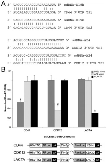 3.5. sdRNA-D19b and sdRNA-A24 Target the 3′UTRs of CD44 and CDK12, Respectively
