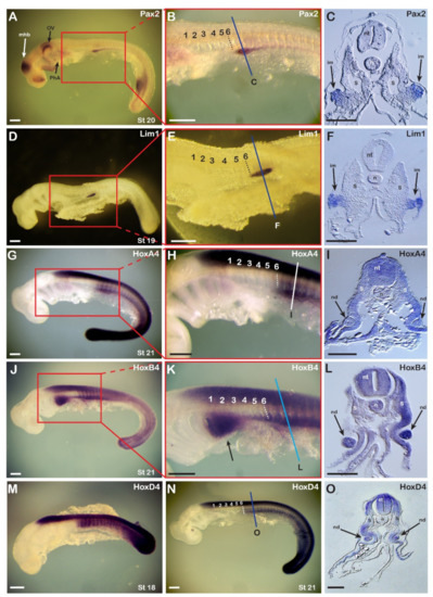 - Barak, H.; Preger-Ben Noon, E.; Reshef, R. Comparative spatiotemporal analysis of Hox gene expression in early stages of intermediate mesoderm formation. Dev. Dyn. 2012, 241, 1637–1649. [Google Scholar] [CrossRef] [PubMed]