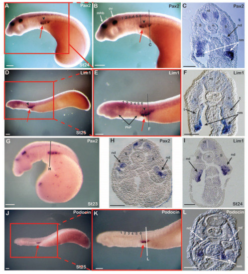 We next examined the expression patterns of the two early pronephric markers Pax2 (Figure 2A–C,G,H) and Lim1 (Figure 2D–F,I) and of the glomerular differentiation marker Podocin (also called NPHS2) [50,51] (Figure 2J–L) by WMISH in lamprey embryos. Pax2 was first detectable in the IM at stage 21 [46] and Lim1 at stage 24 (Figure 2I). All three genes were expressed in the IM with an anterior limit at the level of somite 6, as also observed in the catshark and the chick. However, while IM expression in the latter was continuous, the patterns observed in the lamprey appeared segmented (Figure 2B,E,K). At stages 23 and 24, respectively, the Pax2 and Lim1 expression segments were thus connected dorsally by an inconspicuous gene expression signal, marking short tubules of a systemic duct, the nephric duct (Figure 2A,B,D,E, arrowheads). Cross sections confirmed the expression of all three genes in a specific domain ventral to the somites as well as the formation of the tubules and the nephric duct dorsomedially between the expression segments (Figure 2C,F,L). While Pax2 and Lim1 were initially expressed at stages 23 and 24, respectively, in a domain destined to give rise to the tubules and nephric duct (Figure 2G–I), the signal in these tissues was subsequently downregulated at stages 24 and 25, respectively (Figure 2C,F). In contrast, Pax2 and Lim1 remained expressed in the nephric mesenchyme, which differentiates into the glomerulus later in development (Figure 2C,F). At stage 24, a clear tubule was already observed, and, as expected from its known function in amniotes [50,51], the glomerular differentiation marker Podocin was exclusively expressed in the nephric mesenchyme (Figure 2L), suggesting early-stage differentiation of glomerular tissue.