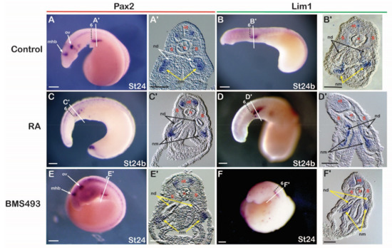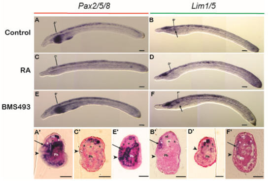 Since the anterior limit of the expression of the nephric genes Pax2 and Lim1 in lamprey embryos was aligned with the sixth somite and resembled the expression of their catshark and amniote homologs, we hypothesized that these expression domains are also sensitive to changing RA signaling levels. To test the involvement of RA in IM specification in the lamprey, embryos at stages 17–18 were exposed to either RA or BMS493 and subsequently fixed at stage 24. The treatments induced clear morphological phenotypes. For example, RA-treated embryos were characterized by significantly reduced head structures (Figure 4C,D), while BMS493-treated embryos had enlarged heads (Figure 4E,F) when compared to control embryos (Figure 4A,B). Moreover, RA treatments significantly reduced the expression of Pax2 in the otic vesicle and the midbrain-hindbrain boundary (Figure 4C). These phenotypes were consistent with previous work on the effects of exogenous RA on lamprey development [52], hence validating our treatment protocols. However, no effects of the RA and BMS493 treatments were observed on the mesodermal, pronephros-associated expression domains of Pax2 and Lim1 (Figure 4A–F). Cross sections demonstrated that the expression of Pax2 and Lim1 in the ventral nephric mesenchyme and the nephric duct were indeed unaffected by the treatments (Figure 4C’–F’) when compared to control embryos (Figure 4A’,B’).